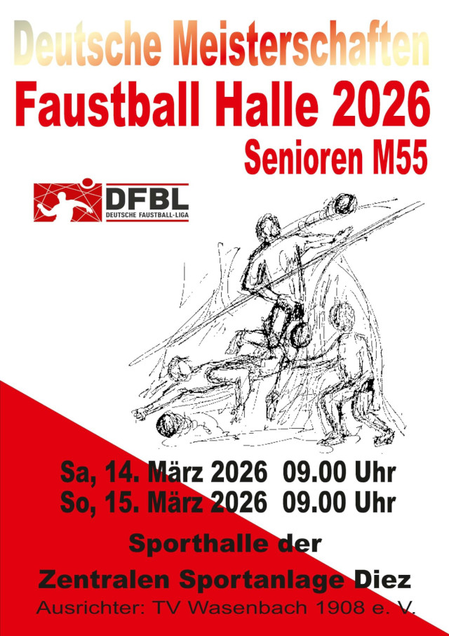 Am 14. und 15. März 2026 werden im Verbandsgebiet des Turnverbandes Mittelrhein, in der Sporthalle der Zentralen Sportanlage in Diez, die Deutschen Meisterschaften im Hallenfaustball der Altersklasse Senioren M55 ausgetragen. Die besten Mannschaften dieser Altersklasse aus ganz Deutschland treten an, um den Deutschen Meistertitel zu ermitteln. Wettkampfbeginn ist an beiden Tagen jeweils um 9:00 Uhr.Ausrichter der Meisterschaften ist der TV Wasenbach, der mit seiner eigenen Mannschaft ebenfalls im Teilnehmerfeld vertreten ist und sich damit auf ein besonderes Heimspiel vor heimischer Kulisse freuen darf.