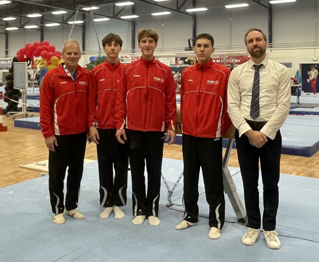 Das Foto zeigt die TVM-Delegation: v.l.n.r.: Joachim Alt (Trainer/Fachwart), Iven Frank, Til Löser, Dimitry Komleva und Benjamin Seegler (Kampfrichterwart)