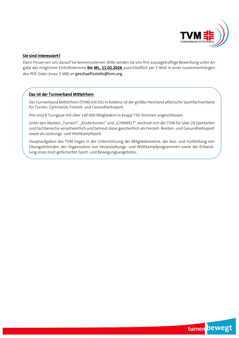 TVM-Geschäftsstelle geschlossen Die Geschäftsstelle des Turnverbandes Mittelrhein geht in Winterpause und bleibt von Montag, 22.12.25, bis einschließlich Freitag, 02.01.26, geschlossen. Ab Montag, 05.01.26, sind wir wieder erreichbar und starten gemeinsam mit Dir in ein neues sportliches Jahr 2026.
