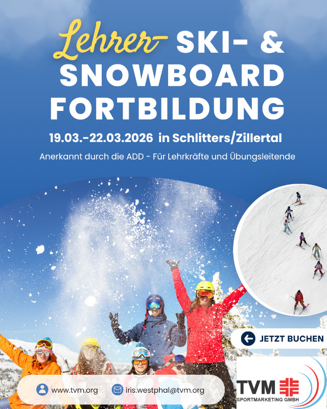 Die ADD-anerkannte Schneesport-Fortbildung im Zillertal findet vom 19. bis 22. März 2026 im Hotel Gasthof Jäger in Schlitters (Österreich) statt. Sie richtet sich an Lehrkräfte verschiedener Schulformen, Ski-Übungsleiter*innen sowie interessierte Gäste. Der Kurs startet am Donnerstag, 19.03.2026, ab 20 Uhr, die Anreise erfolgt individuell.Inhaltlich stehen zeitgemäßer Schneesportunterricht, Sicherheitsaspekte bei Skiausfahrten, das Führen von Gruppen im alpinen Gelände, Technik und Methodik für unterschiedliche Leistungsniveaus sowie Nachhaltigkeit im Wintersport im Fokus. Geleitet wird die Fortbildung vom TVM-Lehrteam, unterstützt durch Verbandsskilehrer (Level 3). Voraussetzung ist sicheres Skifahren.