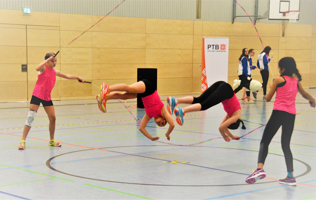 Das Schülerteam des TV Oberstein war bis Ende der Woche war es noch ein gemischtes Team mit Fabio Porini, der dann leider kurzfristig wegen einer Erkrankung passen musste. Um aber weitere Wettkampferfahrung in diesem anspruchsvollen Wettkampf zu sammeln, wurde aus dem gemischten Team dann kurzerhand ein Mädchen Team mit Marine Modrach, Alicia Lopez, Sonia Kumar und Jolie Kullmann. In den Double Dutch Disziplinen reichte die kurze Zeit nicht aus , um noch einigermaßen zu improvisieren, aber gleich in der ersten Disziplin dem SR Speed sorgten die Mädels dann für eine Überraschung, denn mit 290 Sprüngen erreichten sie auf den Punkt die Einzelqualifikation für die DM. Zu allgemeinen Überraschung erreichten sie mit insgesamt 892 Gesamtpunkten aber auch noch die Qualifikation für das Bundesfinale der Teams. Man hat sich aber dann für den Start in der Einzeldisziplin bei der DM entschieden.