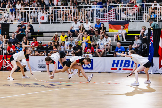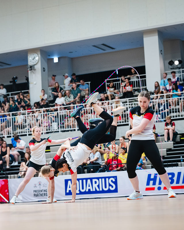 Am Freitag folgten die Junior WM der Teams bei der sich die 5 Obersteinerinnen Zoe Fuchs, Nelly Lorenz, Paulina Ackermann sowie Paula und Marie Schupp der internationalen Konkurrenz stellten. Bei den Juniors werden keine Qualifikationen ausgesprungen, hier muss jeder direkt sein Finalergebnis springen. Aufgrund der guten Ergebnisse im Open Tournement konnten die 5 den Wettkampf eigentlich ganz entspannt angehen. Aber eine WM ist dann doch eine ganz andere Hausnummer als die nationalen Meisterschaften. Zu Beginn des Tages standen die Speeddisziplinen 4 x 30 Sek. SR Speed, 1 Min. DD Speed sowie den 4 x 30 Sek. DD Speed Relay auf dem Programm. Der TVO-Nachwuchs startete mit neuem Bestwert von 312 Sprüngen und Platz 20 in die Disziplin SR Speed mit Nelly, Zoe, Paula und Marie. Im Rahmen war die Minute DD Speed von Nelly, Paula und Zoe mit 133 Sprüngen und einem guten Platz 28. Im DD Speed Relay von Paula, Marie, Nelly und Paulina lief es dagegen von Anfang an überhaupt. Durch einige Hänger konnte sie nur 145 Sprünge erzielen, was Platz 29 bedeutete. Von dieser Enttäuschung mussten sich die 4 erst einmal erholen bevor es in die Freestyles ging.