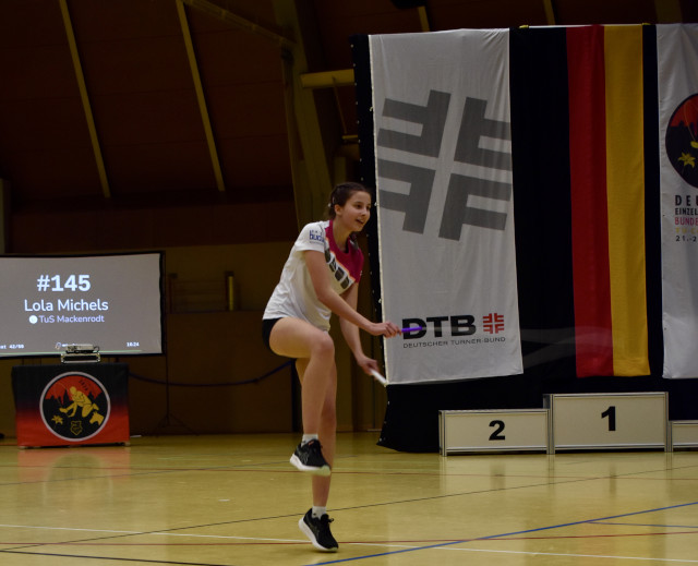 Beim Double Under Cup war nun Lola Michels die einzige Starterin aus Mackenrodt. Sie sprang mit einem Hänger ihren Bestwert und ging mehr als glücklich von der Fläche.