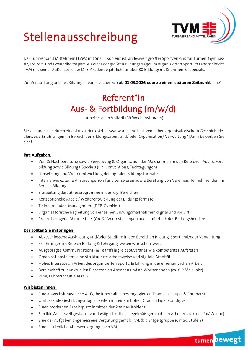 TVM-Geschäftsstelle geschlossen Die Geschäftsstelle des Turnverbandes Mittelrhein geht in Winterpause und bleibt von Montag, 22.12.25, bis einschließlich Freitag, 02.01.26, geschlossen. Ab Montag, 05.01.26, sind wir wieder erreichbar und starten gemeinsam mit Dir in ein neues sportliches Jahr 2026.